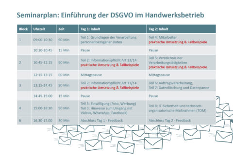 In diesem zweitägigen Seminarangebot werden die wichtigsten Bausteine für die Umsetzung der Datenschutzgrundverordnung (DSGVO) in Handwerksbetrieben bzw. Einzelhandel vermittelt. An Fallbeispielen wird die praktische Anwendung erlernt.